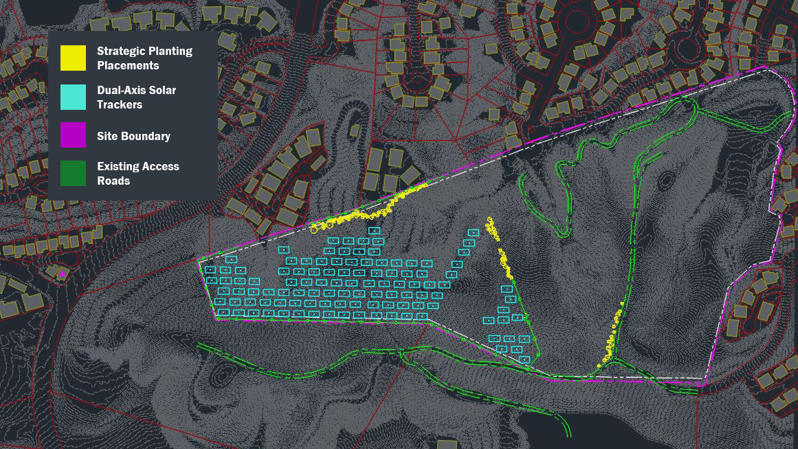 Great Ecology staff combined topographic data with the proposed site design to create an accurate model of the site layout and solar tracker positioning.