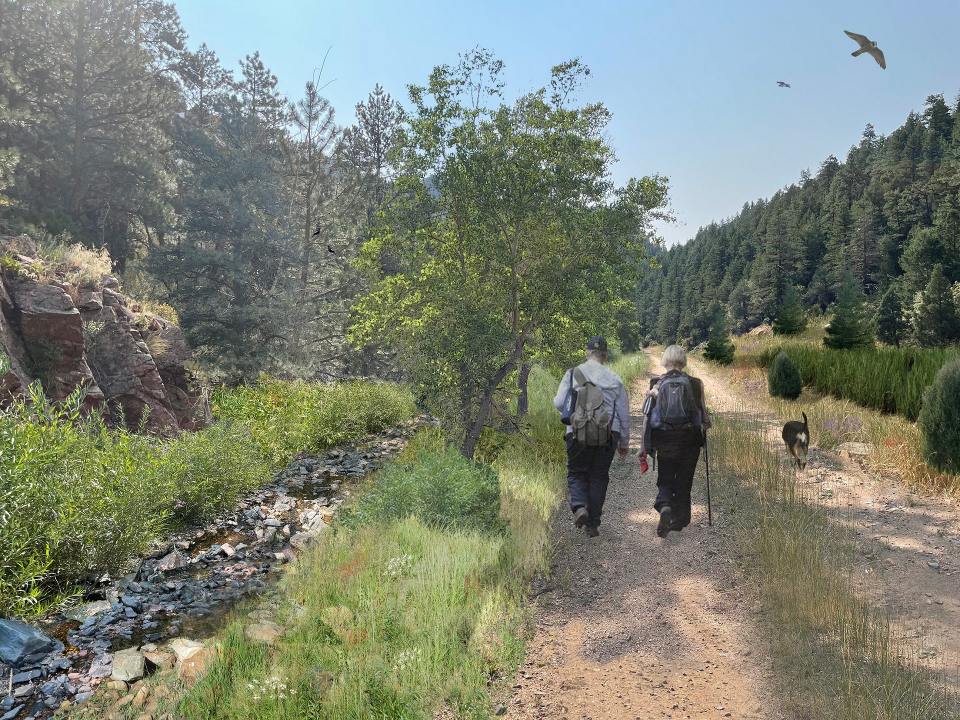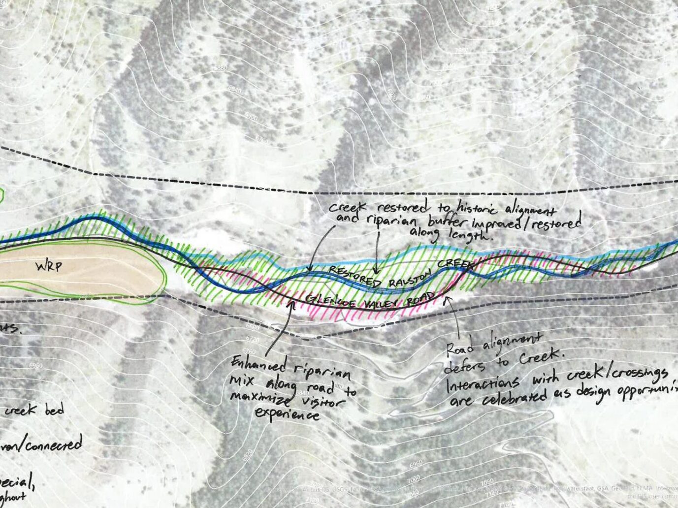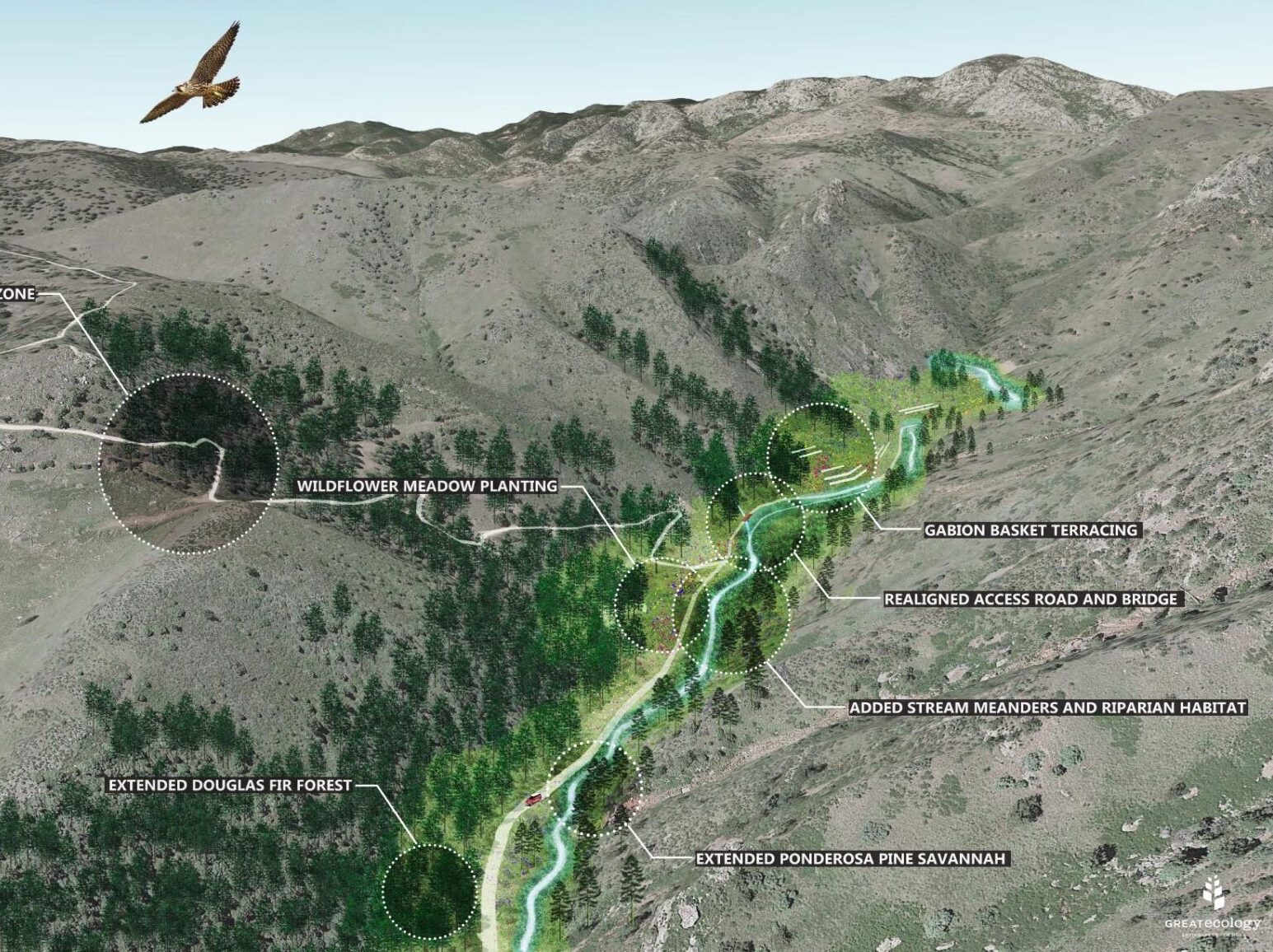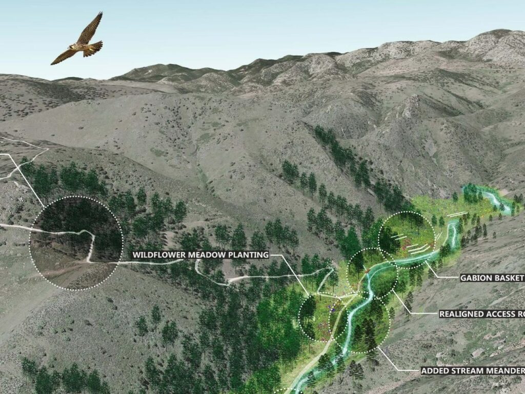 Great Ecology was contracted to develop a conceptual ecological restoration strategy for over 500 acres of land surrounding the former Schwartzwalder Mine, once the largest uranium mine in the United States. This strategy focused on ecological vitality, and beauty and richness, while encouraging adaptive and low impact development. Great Ecology developed renderings that included planned features such as restored wetlands and a natural surface walking path alongside Ralston Creek. Previous redevelopment planning envisioned for the site included the potential addition of a luxury residence and ranch with additional habitat restoration plans identified throughout the site. As part of a separate scope of work, Great Ecology also assessed the current conditions of an upland mitigation area onsite as part of compliance with USACE 404 permitting.