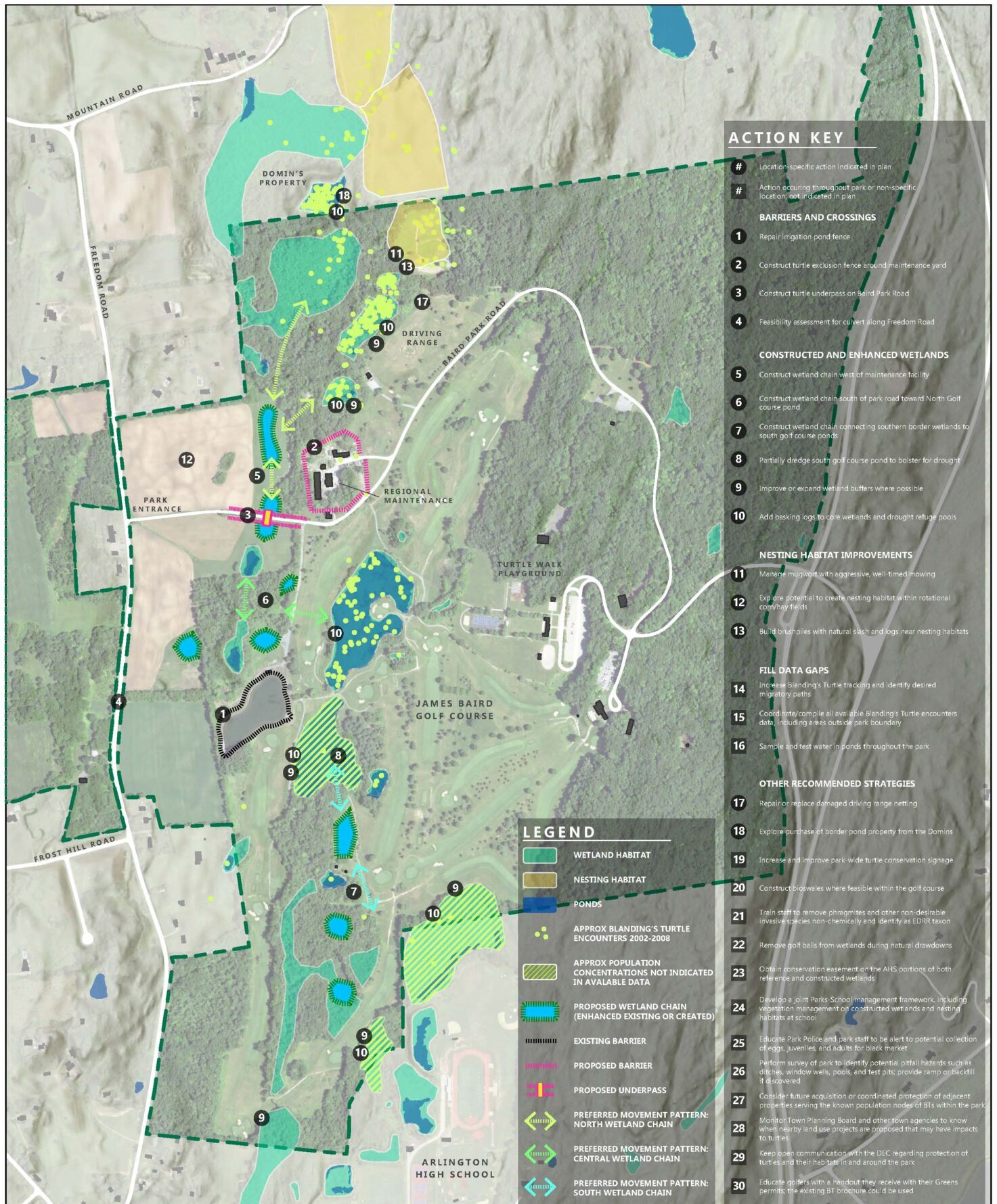 Great Ecology, in collaboration with MKW + Associates, developed a set of conceptual design alternatives for creating Blanding’s turtle habitat corridors within James Baird State Park, in Dutchess County, NY. Several decades of turtle monitoring within the park indicated the existing conditions and competing park uses are problematic because turtles are susceptible to injury/mortality when crossing roads to travel between wetlands and nesting habitats.