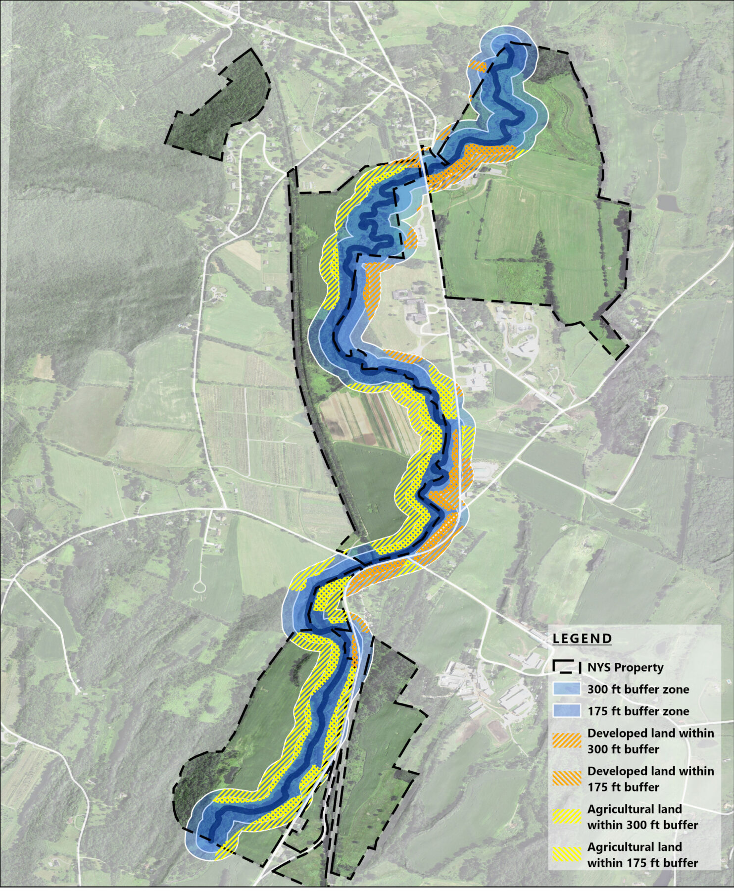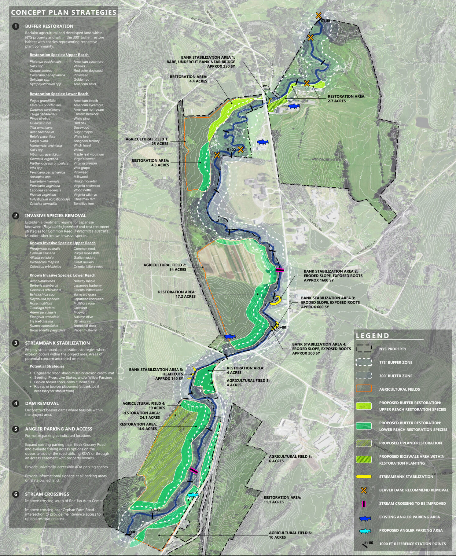 Great Ecology, in collaboration with MKW + Associates, prepared a set of conceptual design alternatives for stream corridor and riparian buffer enhancement within a section of the Roeliff-Jansen Kill, one of the Hudson River’s largest tributaries, located within the Taconic State Park. Great Ecology’s project tasks included performing a data gap analysis for the Roeliff-Jansen Kill watershed and conducting field surveys of the three-mile study area. This included water quality measurements, a visual assessment analysis (using NYSDEC’s “WAVE” protocol), a riparian and streambank vegetation survey (with emphasis on non-native, invasive species), and a preliminary assessment of stream macroinvertebrate assemblages. Great Ecology also reviewed conceptual designs for riparian buffer and stream corridor enhancement alternatives, developed project implementation cost estimates, and developed a matrix of anticipated permits.