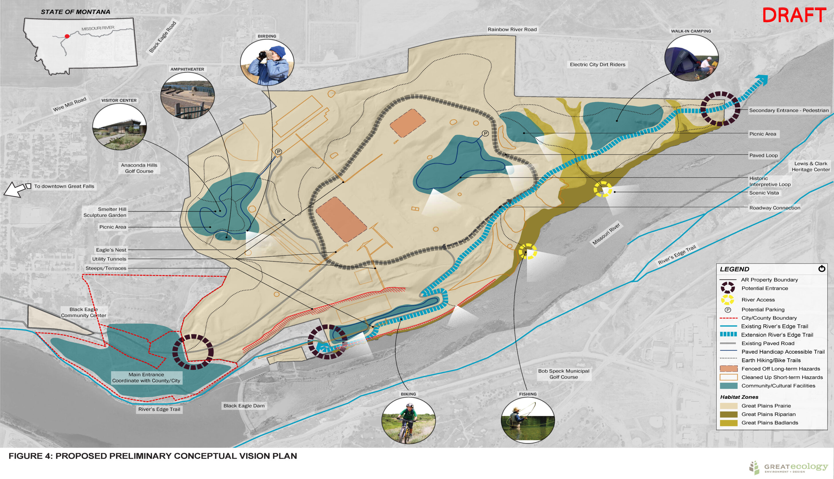 Great Ecology was retained as the ecological consultant by a confidential client to evaluate NRD liability and develop a strategy to reduce the client’s liability through development of a site use visioning plan for the reuse and restoration of a brownfield site adjacent to the Missouri River. Great Ecology assessed upland, riparian, and riverine habitat resources for the 535-acre former refinery and smelting site and developed a vision plan including a regional park and open space that might include passive and active recreation areas and trails, scenic overlooks, picnic areas, and cultural heritage interpretive signage. Located along the Lewis & Clark trail and at the site of a famous encounter with Sacagawea, the open space area holds significant historical value.
