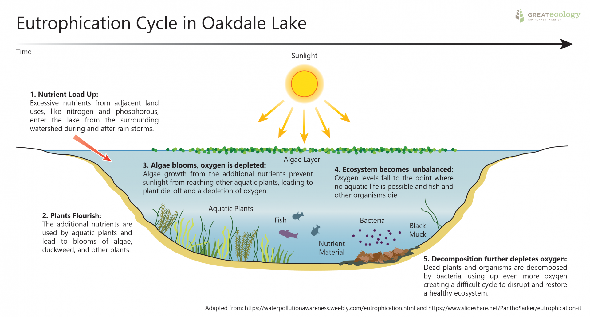Data collected by volunteers was merged with additional sediment and benthic invertebrate sampling completed by Great Ecology to understand existing conditions and potential sources of water impairments. These studies revealed that Oakdale Lake contained excess nutrient loads as a result of runoff from the surrounding watershed, resulting in significant algae blooms leading to die-off of submerged aquatic vegetation (SAV) and depletion of oxygen. To address these issues, Great Ecology developed, and continues to support the implementation of, a multiple-year water quality management plan utilizing various methods such as barley straw application, SAV harvesting, and air diffuser usage.